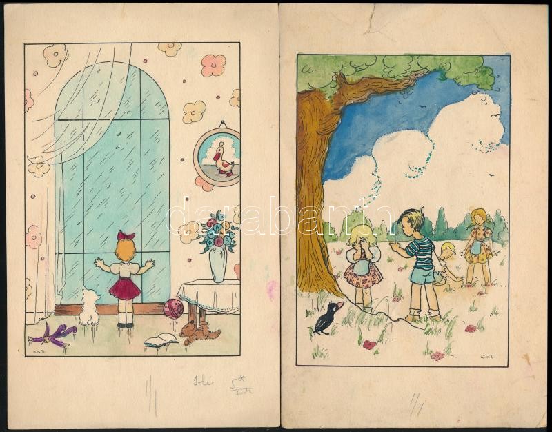 Leírás: KKR jelzéssel: 2 mese illusztráció. Akvarell, tus, papír. 15x11 cm