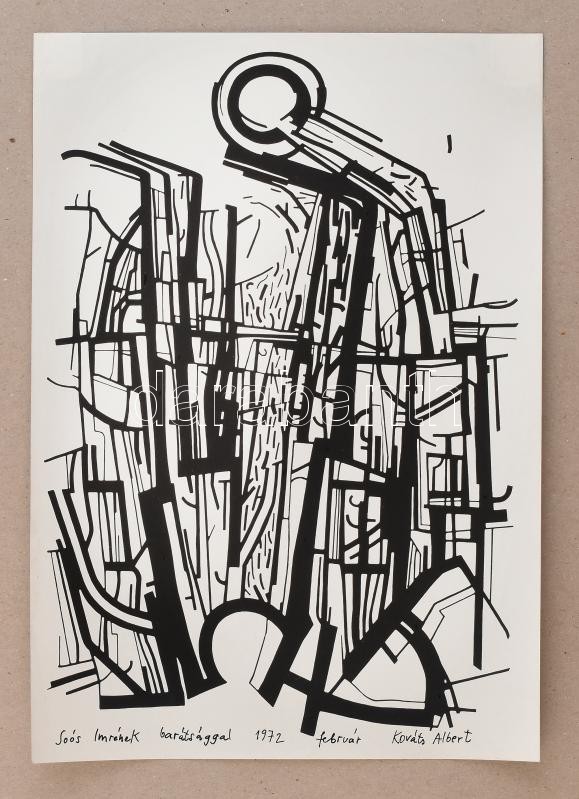 Kováts Albert (1936-): Absztrakt kompozíció. Nyomat, papír, jelzett, Kováts Albert autográf ajándékozási soraival Soós Imre részére 1972-ből, lap teteje papírra kasírozva, 29×20,5 cm. Soós Imre (1921-2013) műgyűjtő, művészeti író, a Kisgrafika folyóirat szerkesztője, a Magyar Nemzeti Galéria Baráti Köre alelnökének hagyatékából.