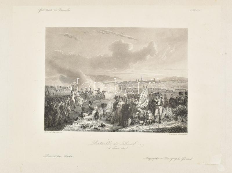 1809 A Győri csata. Brunelliere metszete Gavard, Ch: Galérie historiques de Versailles c. művéből. Acélmetszet. 1809. júlnus 14-én a JÁnos főherceg vezette osztrák sereg, benne magyar nemesi felkelés csapatai a győri csatában vereséget szenvedtek a franciáktól 14x18 cm