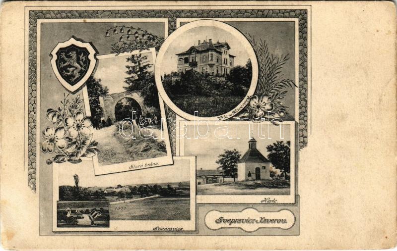 Leírás: 1918 Svépravice Xaverov (Praha, Prag); Stara brána, Kaple, Vila na Xaverové / old gate, chapel, villa. Art Nouveau, floral (EK)