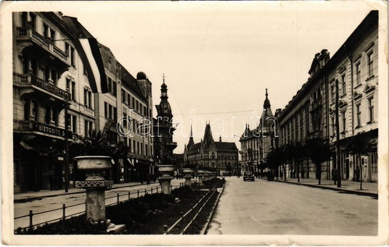 Leírás: 1942 Kolozsvár, Cluj; Horthy Miklós út, Minerva biztosító, üzletek / street view, insurance company, shops, automobile (kis szakadás / small tear)