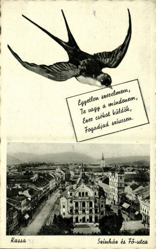 1942 Kassa, Kosice; "Egyetlen szerelmem, te vagy a mindenem, ezer csókot küldök, fogadjad szívesen". Montázslap fecskével / Love greeting montage postcard with swallow