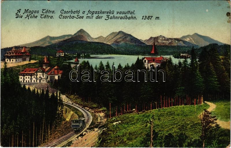 Tátra, Magas-Tátra, Vysoké Tatry; Csorba-tó a fogaskerekű vasúttal / Csorba-See mit der Zahnradbahn / Strbské pleso / cogwheel railway to the lake (fl)