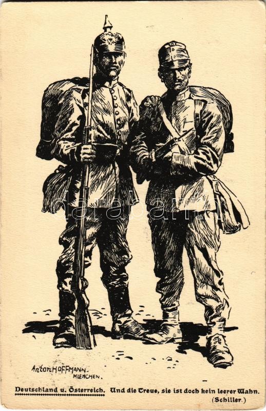 Deutschland und Österreich. Und die Treue, sie ist doch kein leerer Wahn / WWI German and Austro-Hungarian K.u.K. military art postcard, Viribus Unitis propaganda s: Anton Hoffmann (EK)