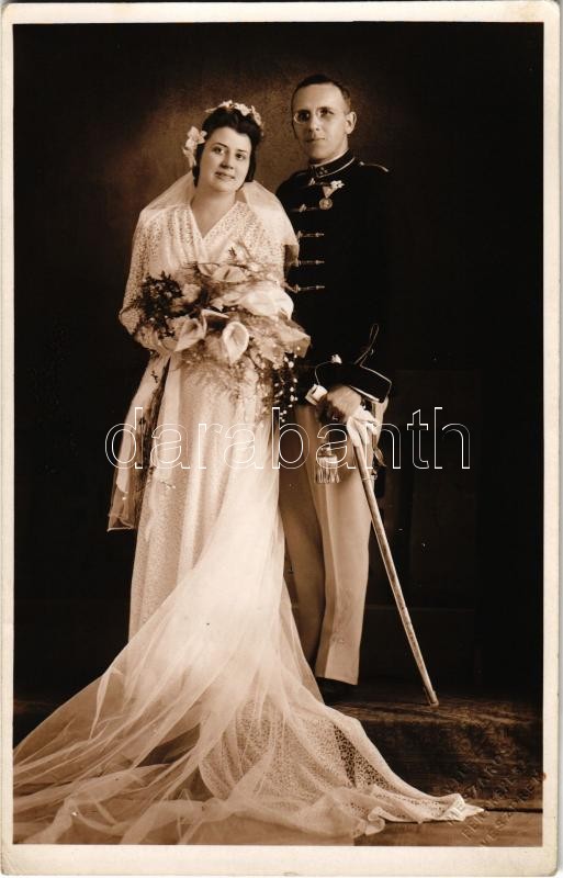 Magyar katona díszruhában feleségével az esküvői fotózáson. Vitéz Mész... https://www.darabanth.com/hu/412-Gyorsarveres/412.0/Kepeslapok/Katonai~2000058/Magyar-katona-diszruhaban-felesegevel-az-eskuvoi-fotozason-Vitez-Meszaros-fenykepesz-~II2568954