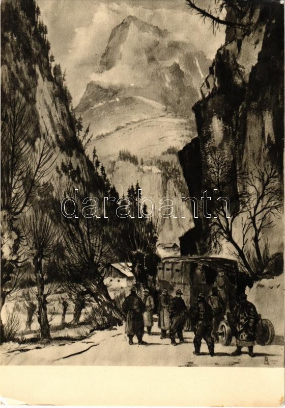 Polizei bei Marschpause im Gebirge. Ausstellung Deutsche Künstler und die SS / WWII German military art postcard, NSDAP German Nazi Party propaganda s: Walter Möbius (EK)