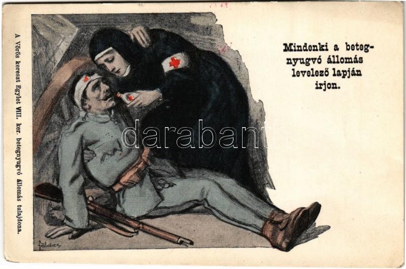 Vörös Kereszt Egylet dunaparti betegnyugvó állomásának tulajdona 1914/15. Hátoldalon bélyegzés / WWI Hungarian Red Cross propaganda art postcard s: Földes