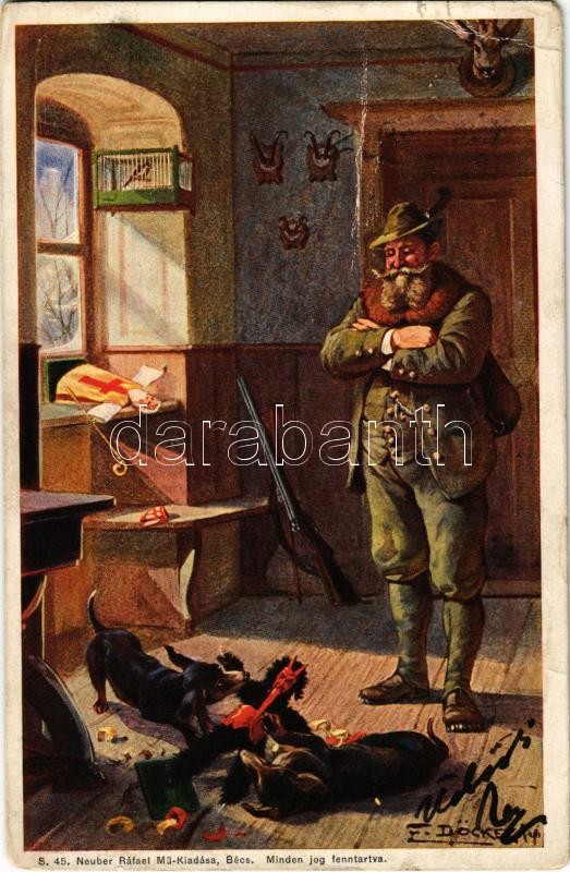 Leírás: 1901 Vadász, tacskó kutyák Krampusz bábuval / Hunter, Dachshund dogs with Krampus doll. Neuber Ráfael S. 45. s: E. Döcker (EK)