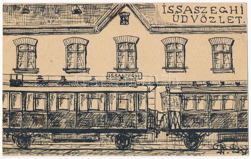 Leírás: 1899 (Vorläufer) Isaszeg, Issaszegh; vasútállomás, vonat. Kézzel rajzolt művészlap (vágott / cut)
