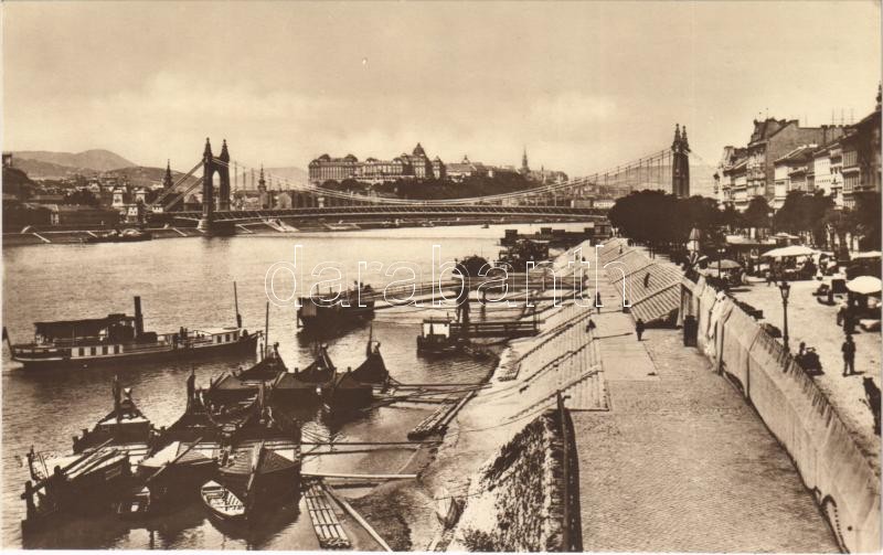 Leírás: Budapest V. Pesti rakpart, Királyi vár, Erzsébet híd, halászhajók, piac