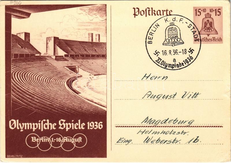 1936 Olympische Spiele Berlin / XI Olympiad / Summer Olympics, Olympic Games in Berlin; 10+15 Ga. s: Georg Fritz + "Berlin K.d.F.-Stadt XI. Olympiade 1936" So. Stpl. (kis szakadás / small tear)