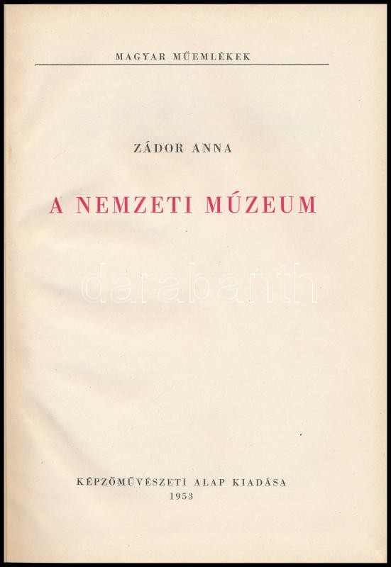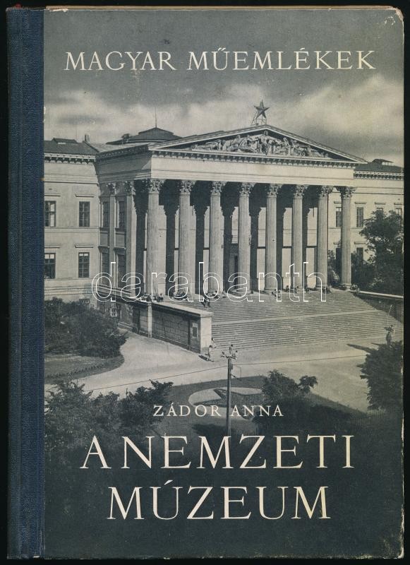 Zádor Anna: A Nemzeti Múzeum. Magyar Műemlékek. Bp., 1953., KépzÅ‘művészeti Alap. Fekete-fehér fotókkal illusztrált. Kiadói félvászon-kötés, kissé kopott borÃtóval. Megjelent 2000 példányban.