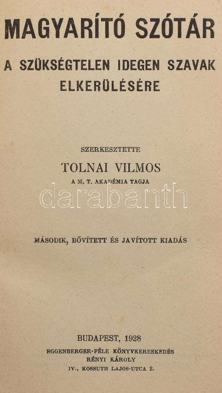 Leírás: Tolnai Vilmos(szerk.): Magyarító szótár, A szükségtelen idegen szavak elkerülésére. Bp., 1928. Eggenberger. Kiadói vászon kötésben