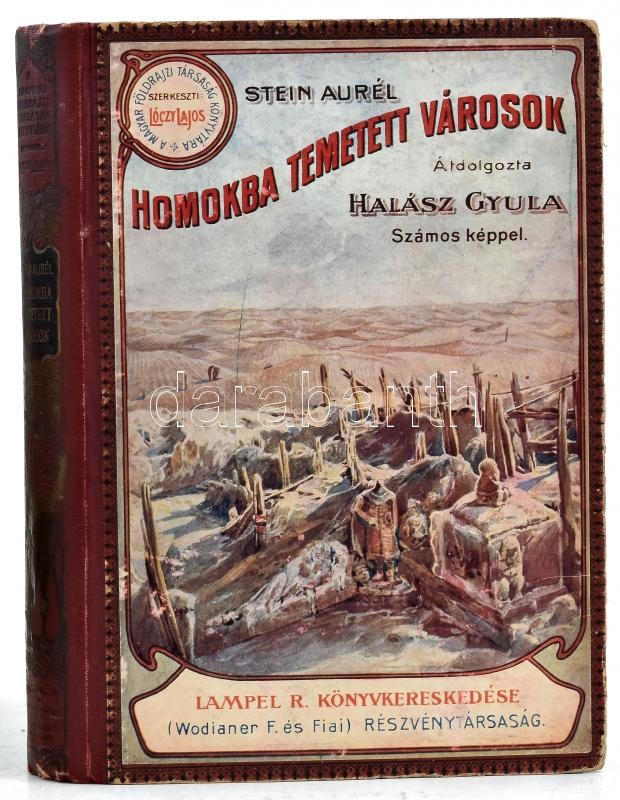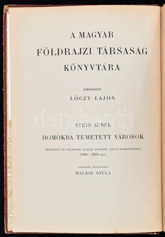Stein Aurél (1862-1943): Homokba temetett városok. Régészeti és földrajzi utazás Indiából Kelet-Turkesztánba. Ford.: Halász Gyula. Magyar Földrajzi Társaság Könyvtára. Bp.,(1908),Lampel R. (Wodianer F. és Fiai) Rt., 1 (Stein Aurél arcképe, címkép) t. + XXIV+326 p.+10 (fekete-fehér fotók, közte két panoráma fotóval) t. Első kiadás. Kiadói illusztrált félvászon-kötés, kopott borítóval, térkép-melléklet nélkül.