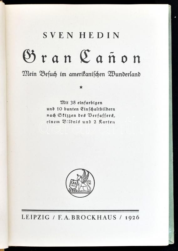 Sven Hedin: Gran Canon. Mein Besuch im amerikanischen Wunderland. Leipzig, 1926., F. A. Brockhaus. Német nyelven. Egészoldalas színes és fekete fehér illusztrációkkal, valamint térkép-melléklettel. Kiadói félvászon-kötésben.