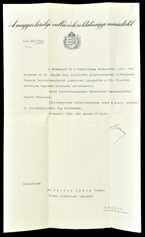 1942 Bp., Hóman Bálint (1885-1951) vallás- és közoktatásügyi miniszter autográf aláírása kinevezési okmányon, fejléces papíron, Halász Gyula ceglédi Áll. Kossuth Gimnázium igazgatója részére, hajtásnyomokkal
