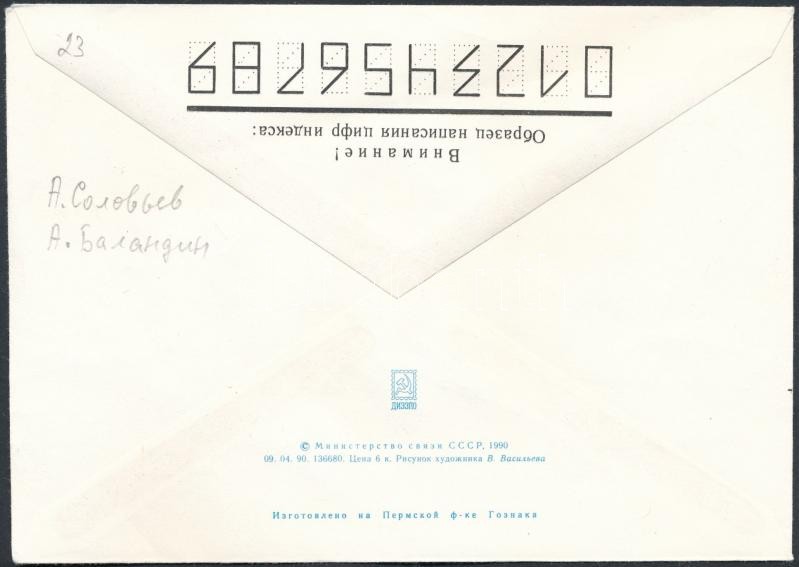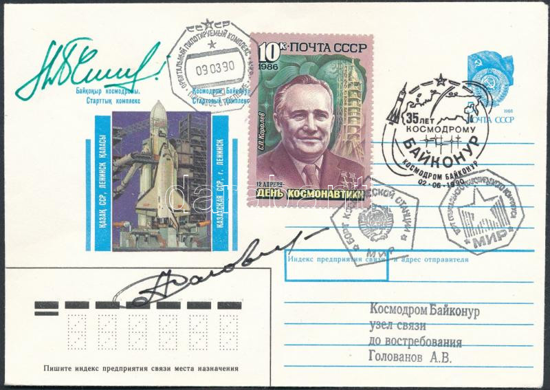 Anatolij Szolovjev (1948- ) és Alekszandr Balangyin (1953- ) szovjet űrhajósok aláírásai emlékborítékon / Signatures of Anatoliy Solovyev (1948- ) and Aleksandr Balandin (1953- ) Soviet astronauts on envelope
