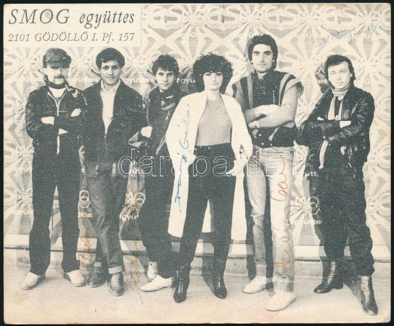 Leírás: Gödöllői Smog együttes tagjainak aláírása az őket ábrázoló képen