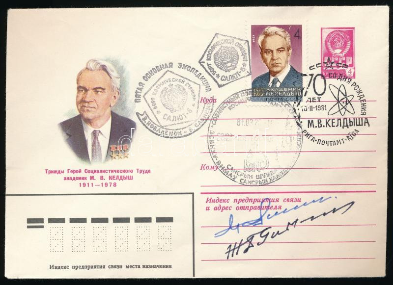 Vlagyimir Dzsanyibekov (1942- ) szovjet és Dzsugderdemidín Gurragcsá (1947- ) mongol űrhajósok aláírásai emlékborítékon /