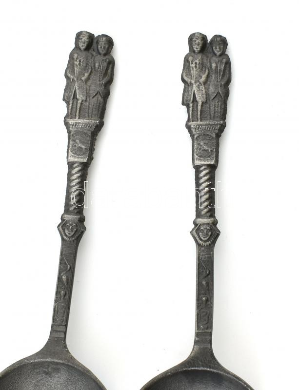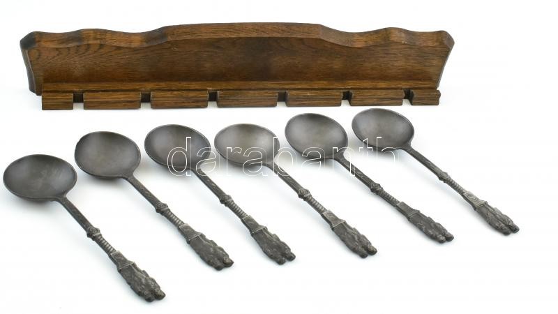 Leírás: 6db jelzett ón kanál, 18cm, fali konzollal, fa, 40x7x4cm