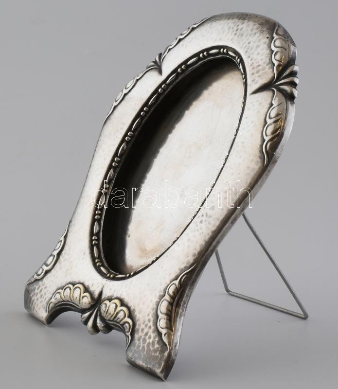 Leírás: Ezüstözött alpakka kitámasztós fényképkeret, jelzett, 13x8,5cm