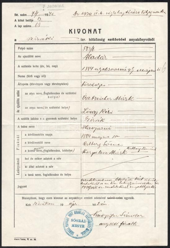 Leírás: 1939 Szirák, kivonat az izraelita hitközség születési anyakönyvéből, főrabbi aláírásával