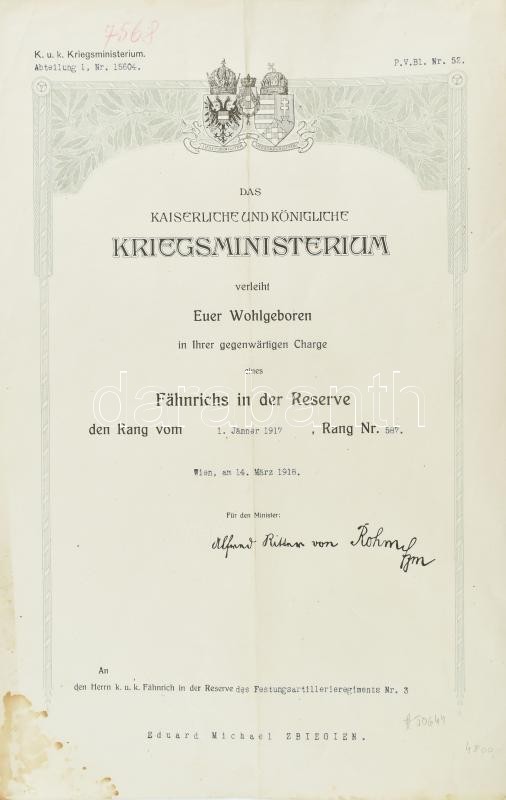 1917 Tartalékos zászlósi kinevezés szárazpecséttel 42x29 cm folttal https://www.darabanth.com/hu/412-Gyorsarveres/412.0/Mutargy-papirregiseg-egyeb/Militaria~500028/1917-Tartalekos-zaszlosi-kinevezes-szarazpecsettel-42x29-cm-folttal~II2568711
