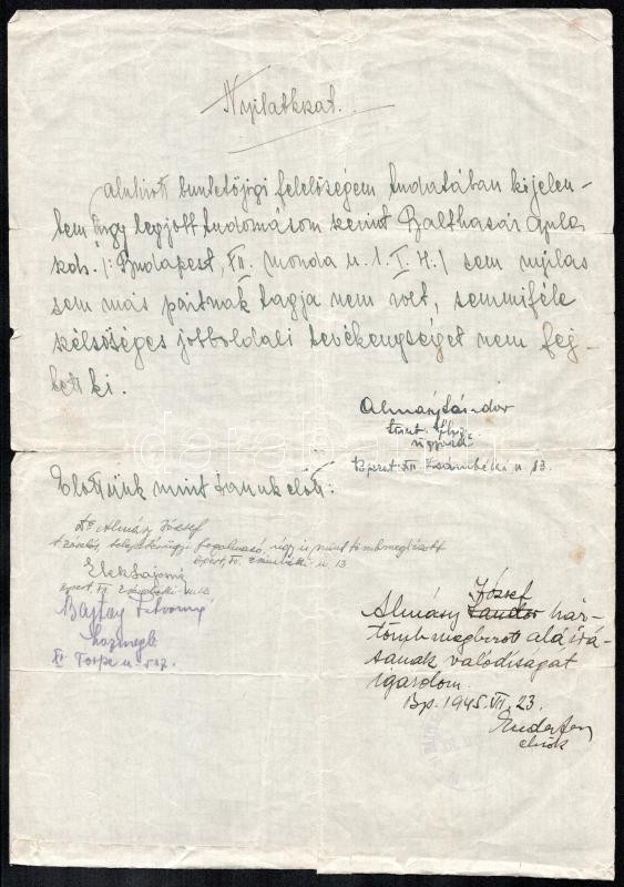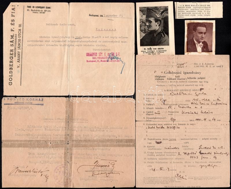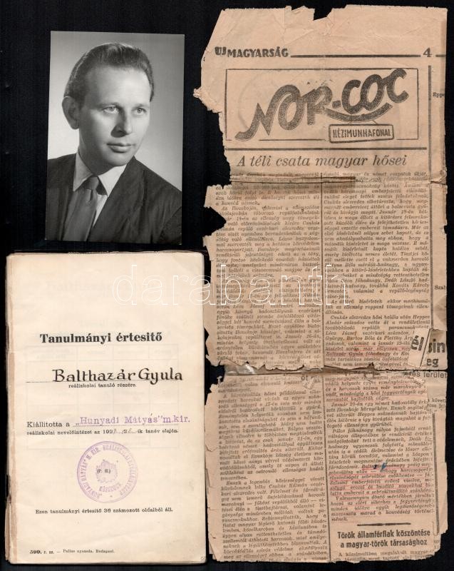 Leírás: cca 1930-1950 Balthazár Gyula repülő százados fotó, hozzá egyéb katonai iratok, újságcikkek nem mind katonai, össz 9 db