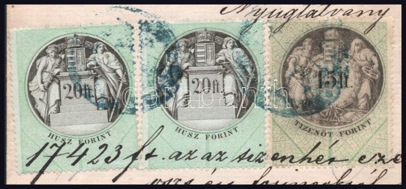 1869 Nyugtatvány az Andrássy Gyula grófnak eladott pesti városligeti földek vételárának kiegyenlítéséről sárga papírú 15Ft és 2 db fehér papírú 20Ft okmánybélyegekkel. Magas katalógus érték!!