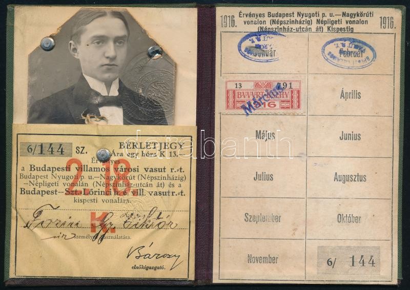 Leírás: 1916 Fényképes bérletjegy a Budapest-szentlőrinci helyi érdekű villamosvasútra beragasztott jeggyel, szép állapotban