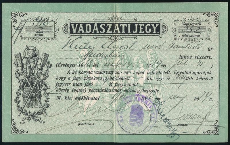 1918 Vadászati jegy jó állapotban / Hunter licence