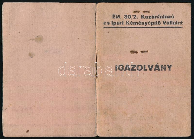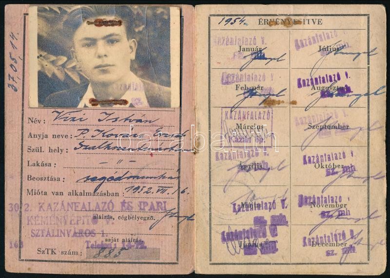 1954 Sztálinvárosi Kazánfalazó Vállalat arcképes igazolvány https://www.darabanth.com/hu/412-Gyorsarveres/412.0/Mutargy-papirregiseg-egyeb/Okmanyok~500018/1954-Sztalinvarosi-Kazanfalazo-Vallalat-arckepes-igazolvany~II2564732