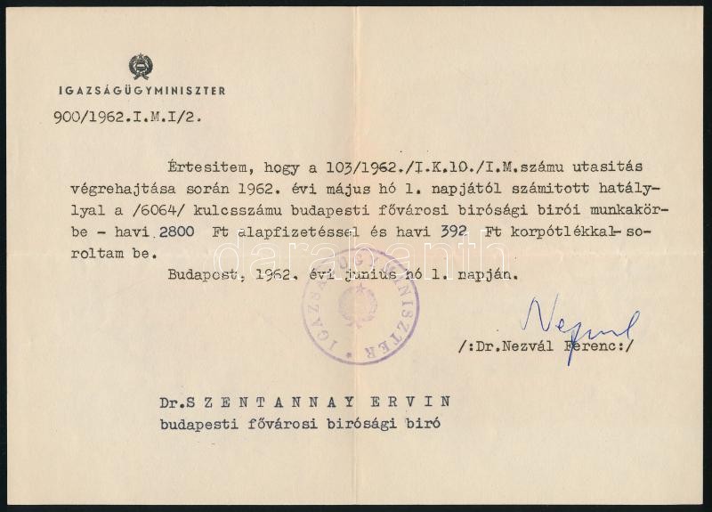Leírás: 1962 Bp., Nezvál Ferenc igazságügy-miniszter által aláírt okirat