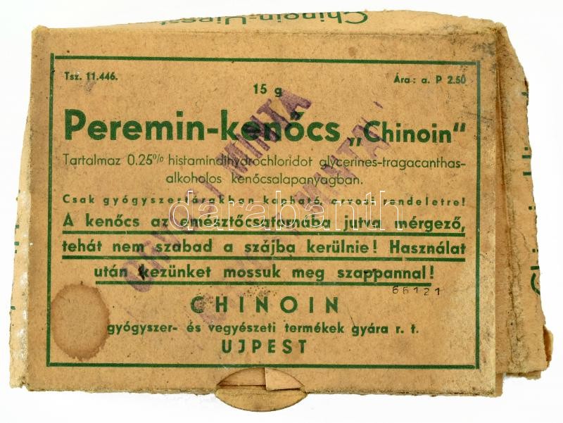 'Peremin-kenőcs "Chinoin" papírdoboz, tartalommal, Újpe... https://www.darabanth.com/hu/412-Gyorsarveres/412.0/Mutargy-papirregiseg-egyeb/Reklam~500022/Peremin-kenocs-Chinoin-papirdoboz-tartalommal-Ujpest-Chinoin-foltos-kisse-serult-doboz~II2529817