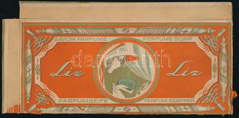 Leírás: cca 1920-1940 Liz parfum szappan, régi kartondoboz illusztrált töredékes fedele, sérült, 12x26 cm