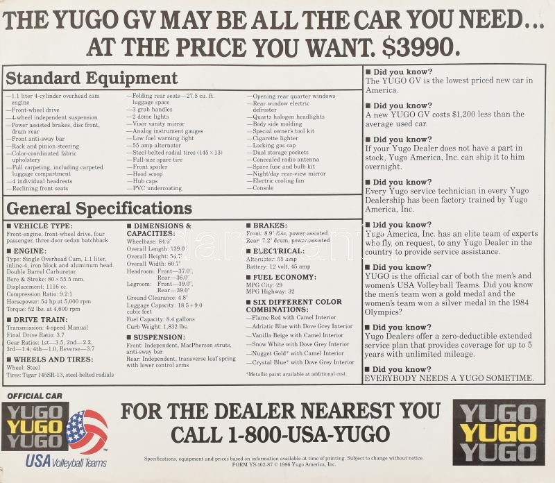 cca 1984 Yugo autó amerikai reklám hátoldalán technikai részletekkel 2... https://www.darabanth.com/hu/412-Gyorsarveres/412.0/Mutargy-papirregiseg-egyeb/Reklam~500022/cca-1984-Yugo-auto-amerikai-reklam-hatoldalan-technikai-reszletekkel-27x23-cm~II2570930