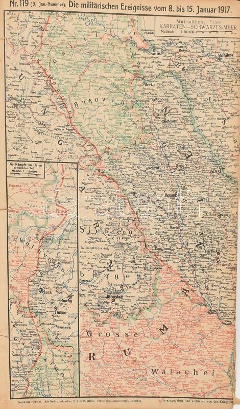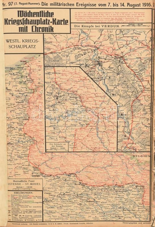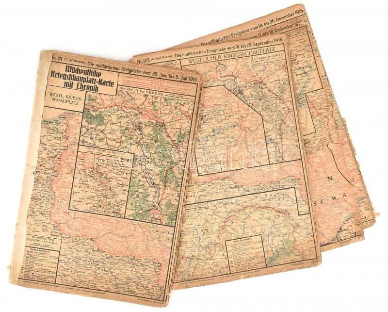 Leírás: 1916 30 db I, világháborús front térkép az összes hadszintér térképével. No. 91-119. Júniustól decemberig.. Kihajthatók. Kisebb sérülésekkel 34x70 cm
