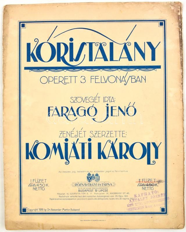 1918 Komjáti Károly: Kóristalány, operett 3 felvonásban, kiadja: Rózsa... https://www.darabanth.com/hu/412-Gyorsarveres/412.0/Mutargy-papirregiseg-egyeb/Zenetortenet-Kottak-Hangszerek~1000001/1918-Komjati-Karoly-Koristalany-operett-3-felvonasban-kiadja-Rozsavolgyi-es-Tarsa-kopo~II2173205