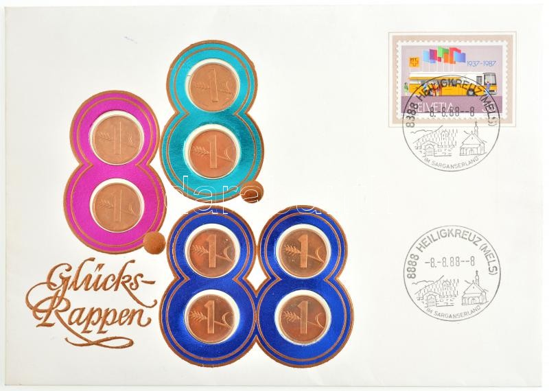Svájc 1984. 1r bronz (8x) "Szerencselevél - 88.8.8. Heiligkreuz" felbélyegzett borítékon, alkalmi bélyegzővel, német nyelvű leírással T:1,1-