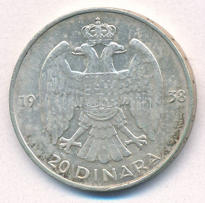 Yugoslavia ... https://www.darabanth.com/hu/412-Gyorsarveres/412.0/Numizmatika/Kulfoldi-fem-es-ezustpenzek~1500014/Jugoszlavia-1938-20D-Ag-II-Peter-T2-patina-Yugoslavia-1938-20-Dinara-Ag-Petar-II-CXF-pat~II2568078