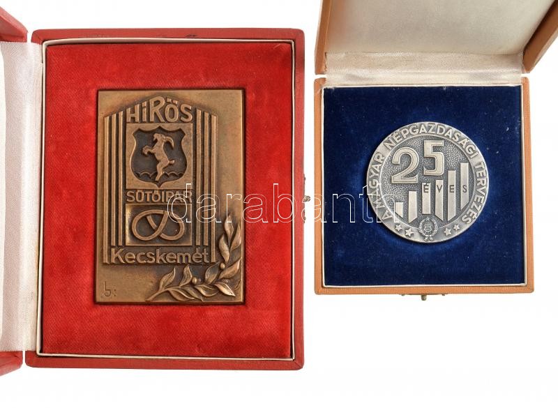 Leírás: Lajos József (1936-) DN "Hírös Sütőipar Kecskemét" Br plakett (105x75mm) díszdobozban + 1972. "25 éves a magyar népgazdasági tervezés 1947-1972" ezüstözött fém plakett dísztokban (60mm) T:1-