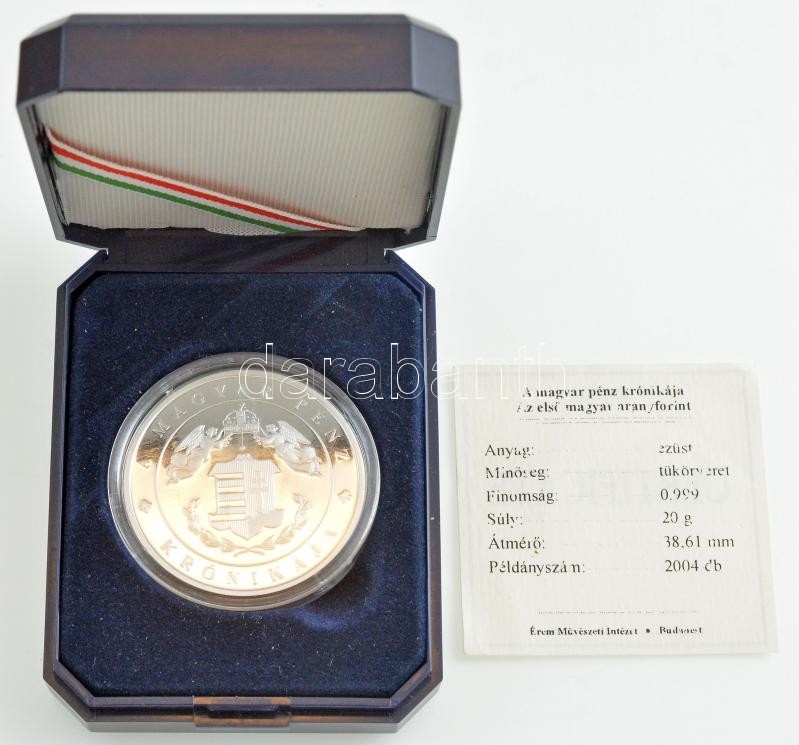 Leírás: DN "A magyar pénz krónikája - Az első magyar aranyforint" Ag emlékérem, tanúsítvánnyal, dísztokban (20g/0.999/38,61mm) T:PP