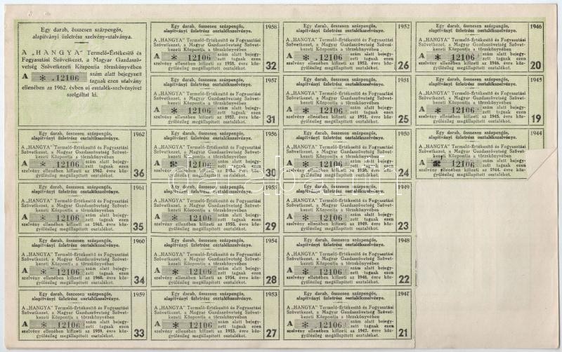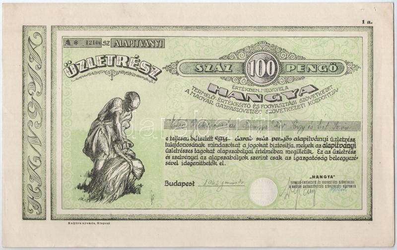Budapest 1942. "Hangya Termelő-Értékesítő és Fogyasztási Szövetkezet" névre szóló részvénye 100P-ről, szárazpecséttel, szelvényekkel T:I- jobb felső sarkában tűnyom