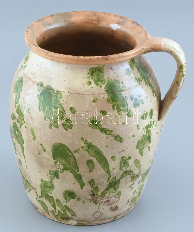 Csákvári füles köcsög, népi kerámia, kopott, sérülésekkel, m:23cm https://www.darabanth.com/hu/412-Gyorsarveres/412.0/Porcelan-keramia-uveg/Keramiak~500005/Csakvari-fules-kocsog-nepi-keramia-kopott-serulesekkel-m23cm~II2572018