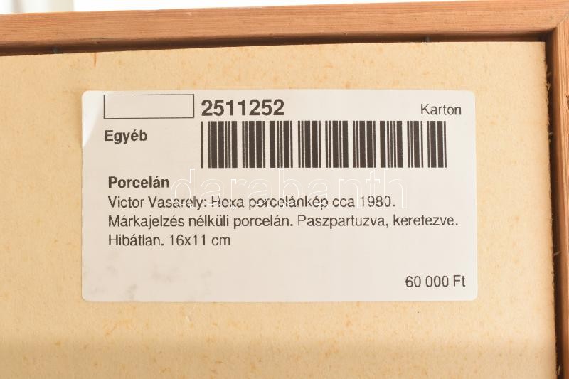 Victor Vasarely: Hexa porcelánkép cca 1980. Márkajelzés nélküli porcel... https://www.darabanth.com/hu/412-Gyorsarveres/412.0/Porcelan-keramia-uveg/Porcelan~500006/Victor-Vasarely-Hexa-porcelankep-cca-1980-Markajelzes-nelkuli-porcelan-Paszpartuzva-keret~II2511252