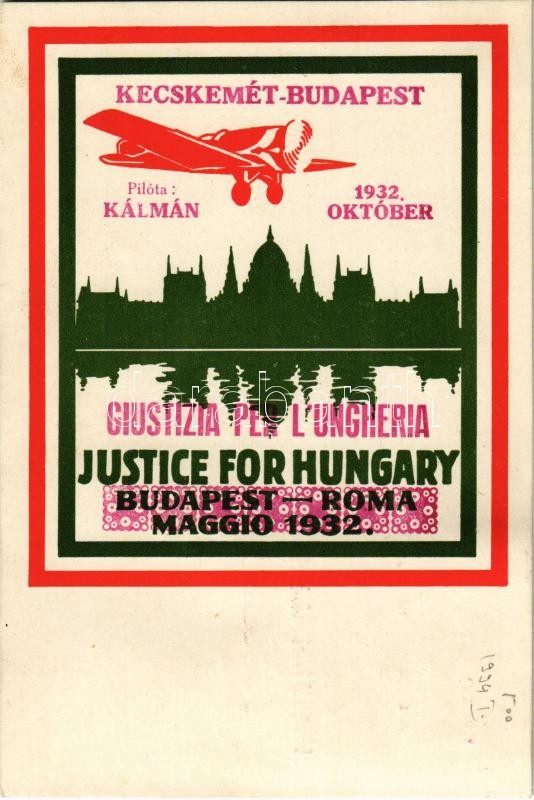 Leírás: Justice for Hungary Budapest-Roma Maggio 1932. Kecskemét-Budapest 1932. Október, Pilóta: Kálmán / Hungarian irredenta art