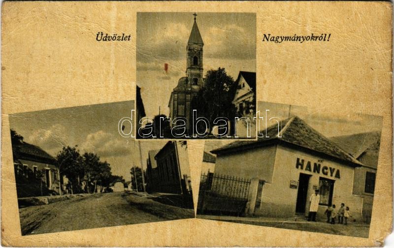 Leírás: 1944 Nagymányok, templom, utca, Hangya szövetkezet üzlete és saját kiadása (EM)