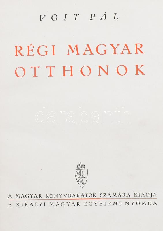 Voit Pál: Régi magyar otthonok. Bp., 1943, Kir. M. Egyetemi Nyomda. Gazdag fekete-fehér képanyaggal illusztrálva. Kiadói félvászon-kötés, kissé kopott borítóval.
