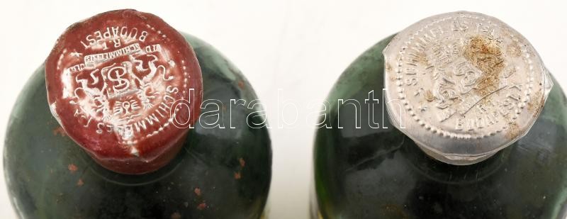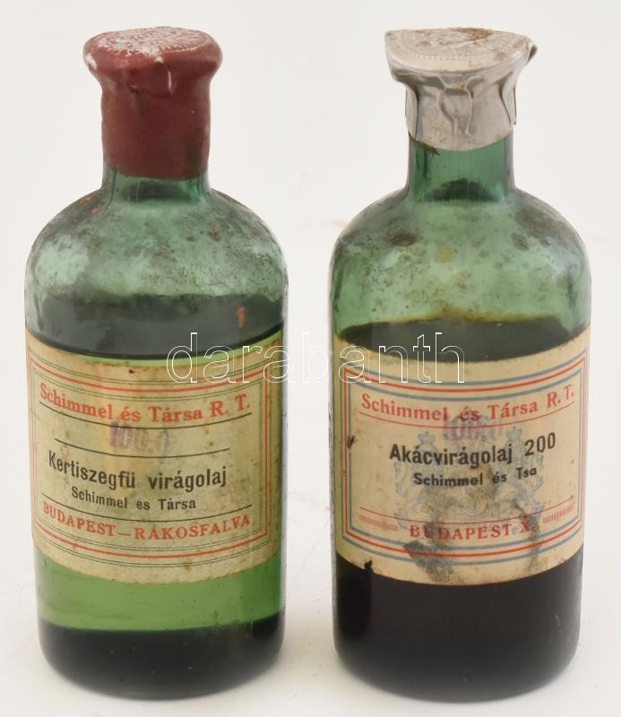 2 db Schimmel és Társa Rt. Illóolaj- és Vegyészeti Gyár Budapest parfüm alapanyag, akácvirágolaj és kerti szegfű virágolaj, címeres fém kupakkal, tartalommal