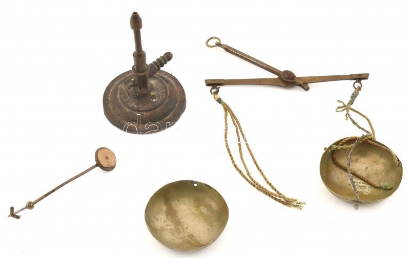 Leírás: 3 db régi fémtárgy: kézi mérleg, Bunsen égő, óra inga, koruknak megfelelő állapotban